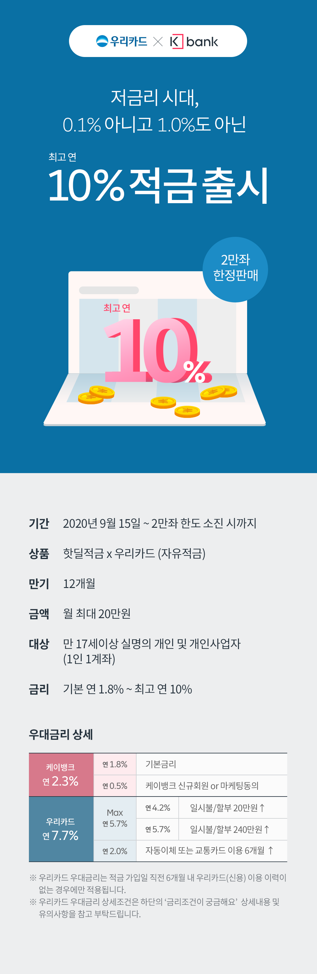 우리카드 x 케이뱅크 [최고 연 10% 적금 출시] 이벤트 정보입니다.