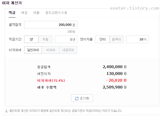 참고로 연 10% 적금 금리를 적용받는 경우, 1년 만기 후 대략적인 이자 금액과 세후 실 수령액은 아래 결과를 참고하세요.