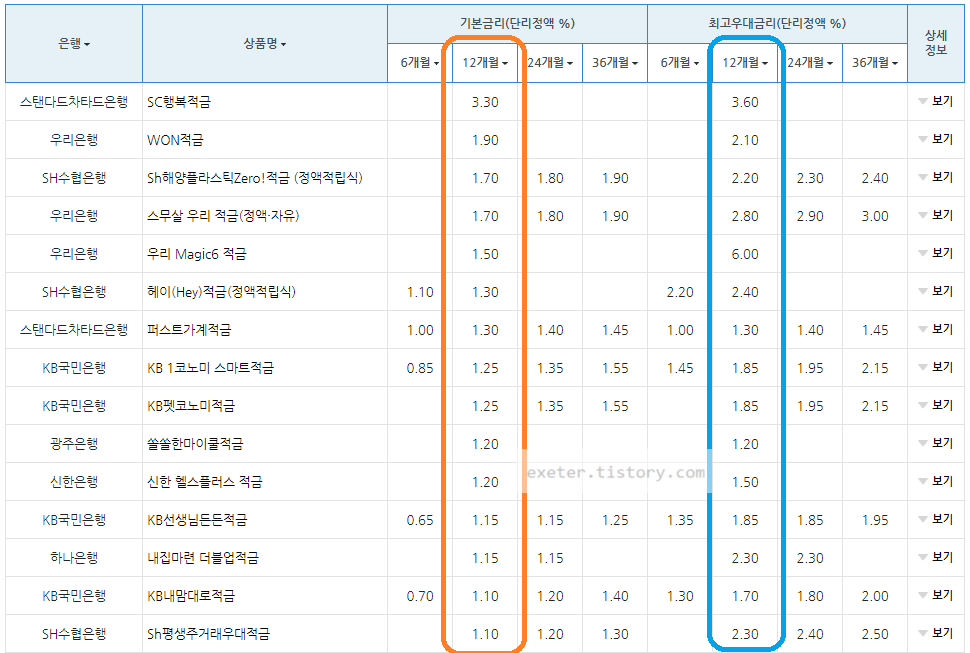 은행 / 상품명 / 정액 적립식 기본금리 (단리 이자%, 12개월 기준)