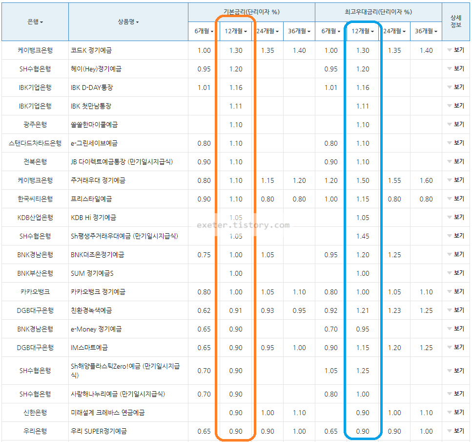 2020년 10월 5일 기준, 정기예금 기본금리가 높은 순서로 상위 10개는 아래와 같습니다.