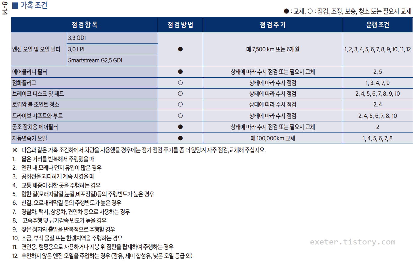 참고로 차량 설명서에서는 '가혹 조건'인 경우 교환/점검 주기를 빠르게 가져가도록 안내하고 있습니다.