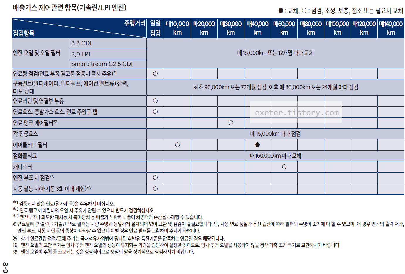 아래 사진은 그랜저 가솔린/LPI 차량 매뉴얼에서 캡처한 것이지만, 국내 현대/기아 소형/준중형/중형 일반 모델에서는 모두 공통적으로 적용 가능한 일반적인 내용으로 보입니다. (예를 들어 K3/아반떼 메뉴얼과 비교해보면 엔진오일/구동벨트, 점화플러그 등의 교체 주기가 동일합니다)