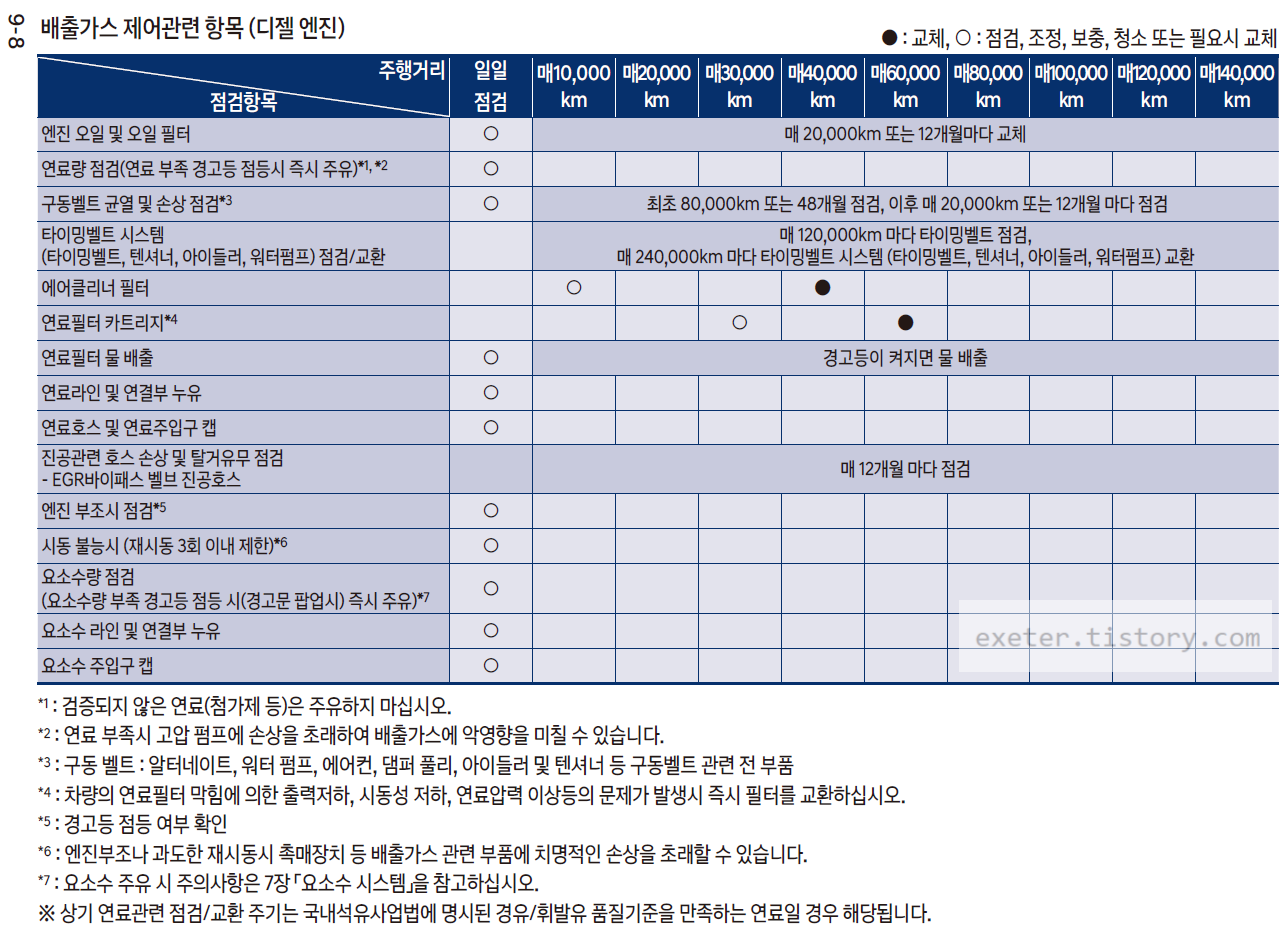 - 에어클리너 필터: 매 40,000km 마다 교체 (매 10,000km 점검)
