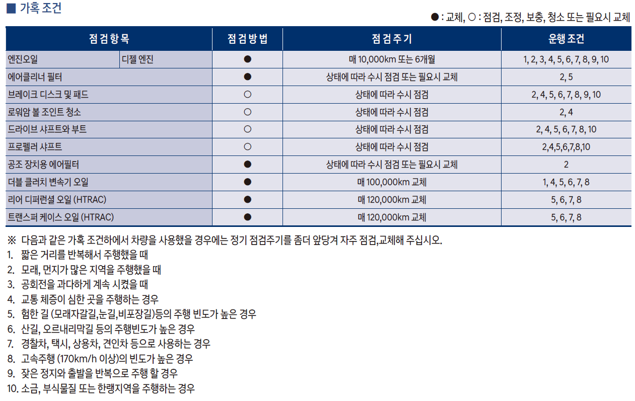참고로 차량 설명서에서는 '가혹 조건'인 경우 교환/점검 주기를 빠르게 가져가도록 안내하고 있습니다.