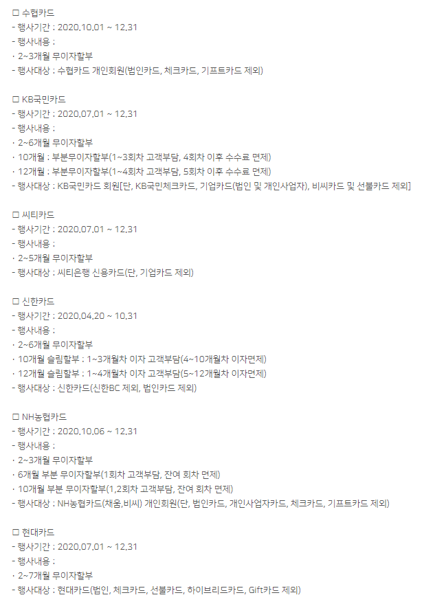 · 10개월 : 부분무이자할부(1~3회차 고객부담, 4회차 이후 수수료 면제)