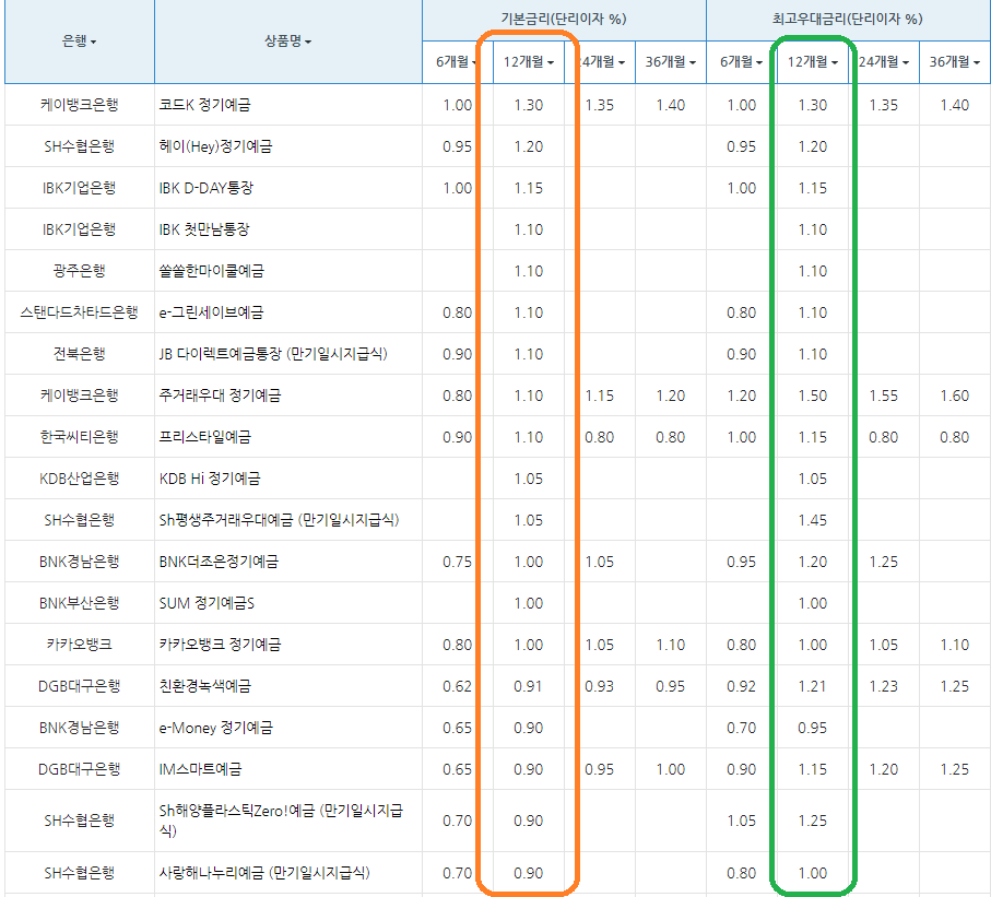 은행 / 상품명 / 기본금리 (단리 이자(%), 12개월 기준)