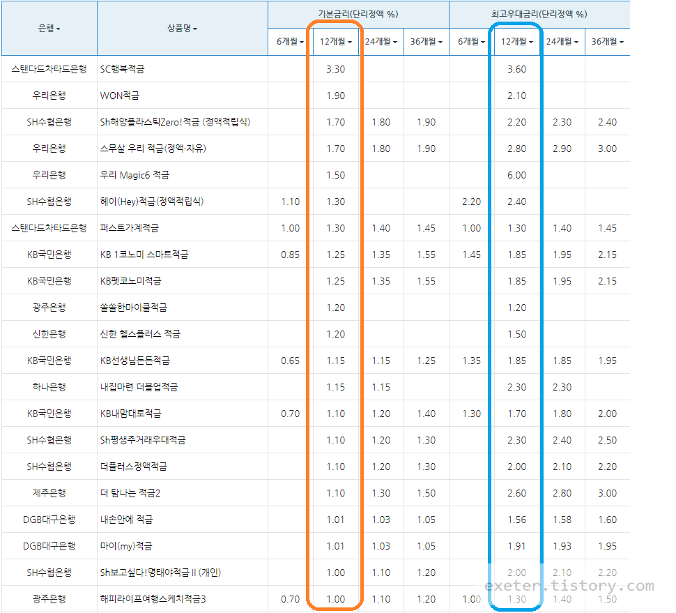 은행 / 상품명 / 정액 적립식 기본금리 (단리 이자%, 12개월 기준)