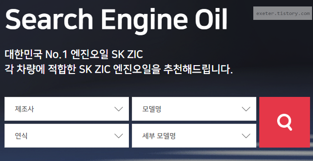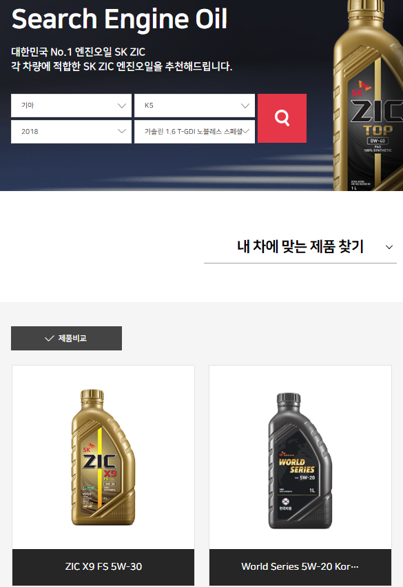 SK ZIC 홈페이지에서도 아래와 같이 차량 정보를 입력하면 지크 엔진오일 제품을 찾아주고 있습니다.