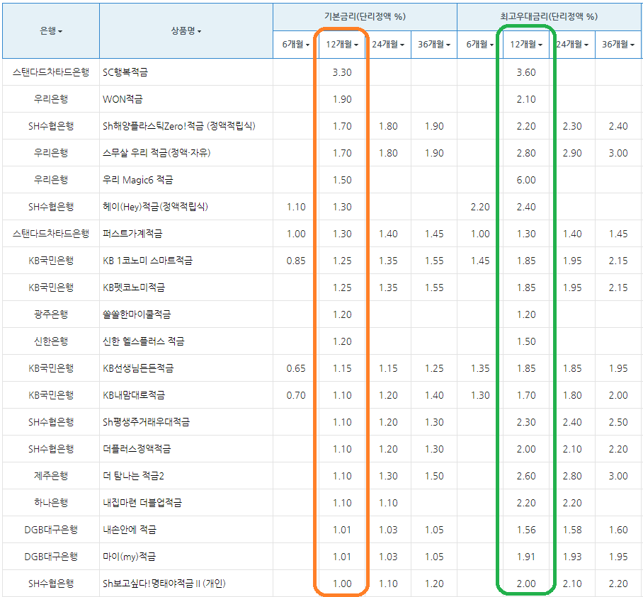 은행 / 상품명 / 정액 적립식 기본금리 (단리 이자%, 12개월 기준)