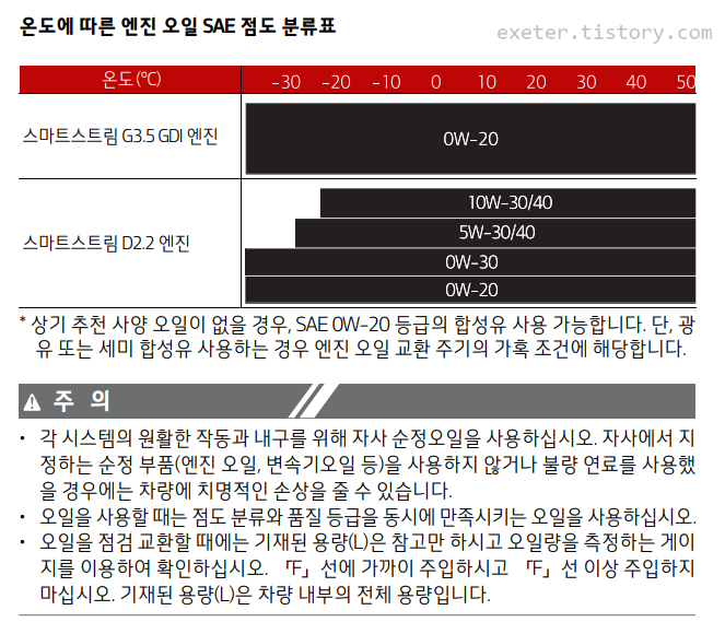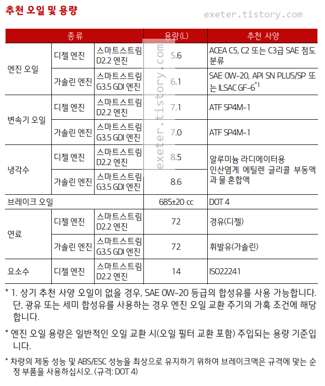 최근 발표되는 현대/기아차 신차의 경우, 매뉴얼에서 최신 규격인 API SP/GF-6 (가솔린)엔진오일을 추천하고 있습니다.