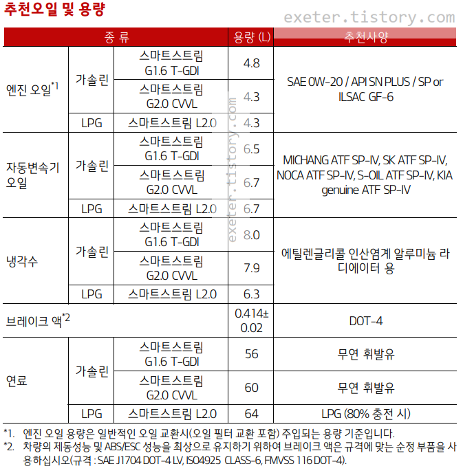 엔진 오일(가솔린 1.6T): 4.8 리터(L)