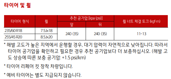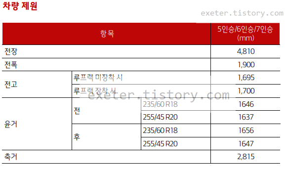 기아자동차 홈페이지 취급설명서, 4세대 SORENTO Hybrid (MQ4 HEV) 매뉴얼에서 발췌한 내용입니다. 참고로 2021년식 쏘렌토 매뉴얼 자료입니다. <차량 제원> 전장: 4,810mm 전폭: 1,900mm 전고: 1695mm <타이어.