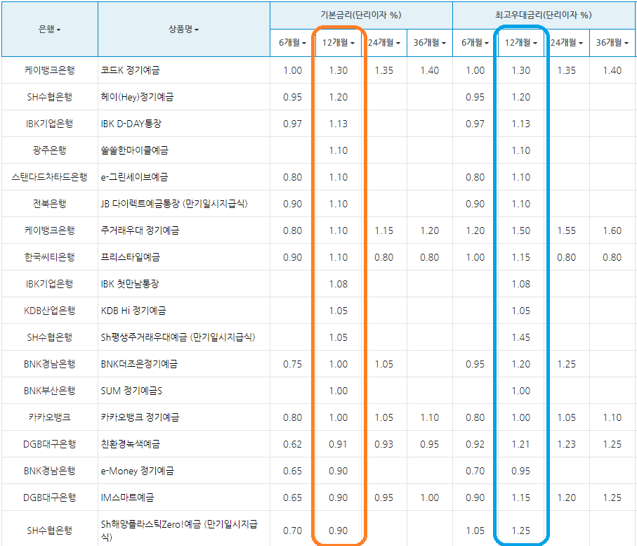 2020년 11월 12일 기준, 정기예금 기본금리가 높은 순서로 상위 10개는 아래와 같습니다.