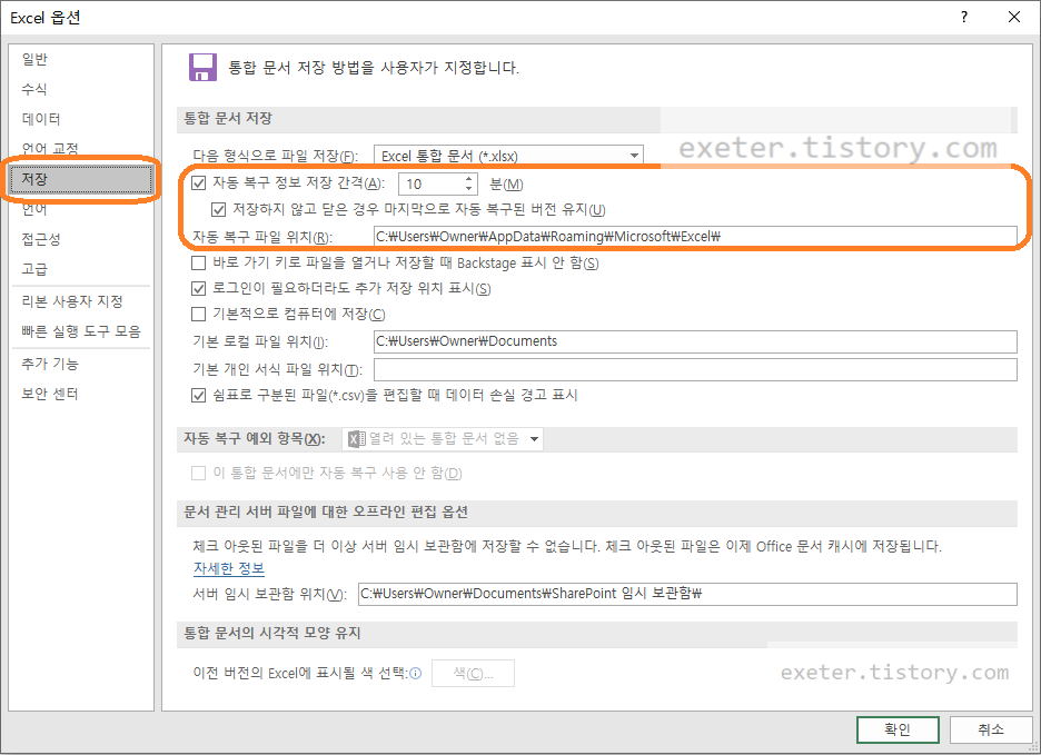 보통 기본 옵션 값으로 '10분' 단위로 자동으로 저장하고 있고, 이때 '자동 복구 파일 위치' 디렉터리에 해당 파일이 자동 Save 되고 있습니다.