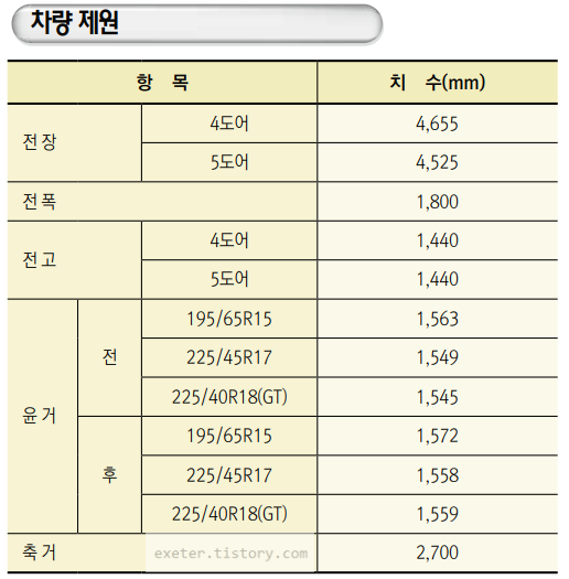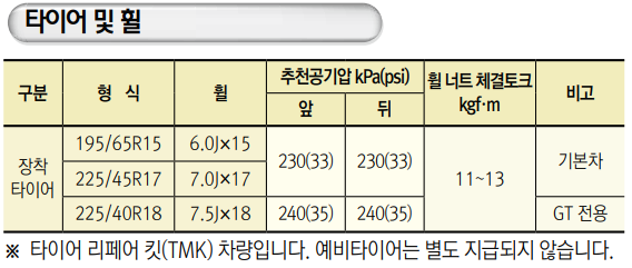 타이어 형식: 195/65R15, 225/45R17, 225/40R18