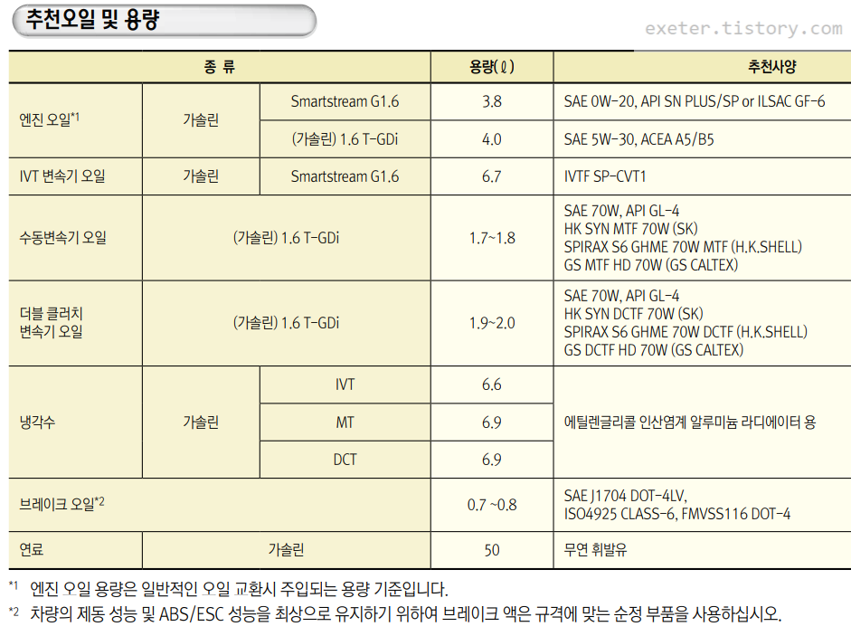 엔진 오일(가솔린 스마트스트림 1.6): 3.8 리터(L)