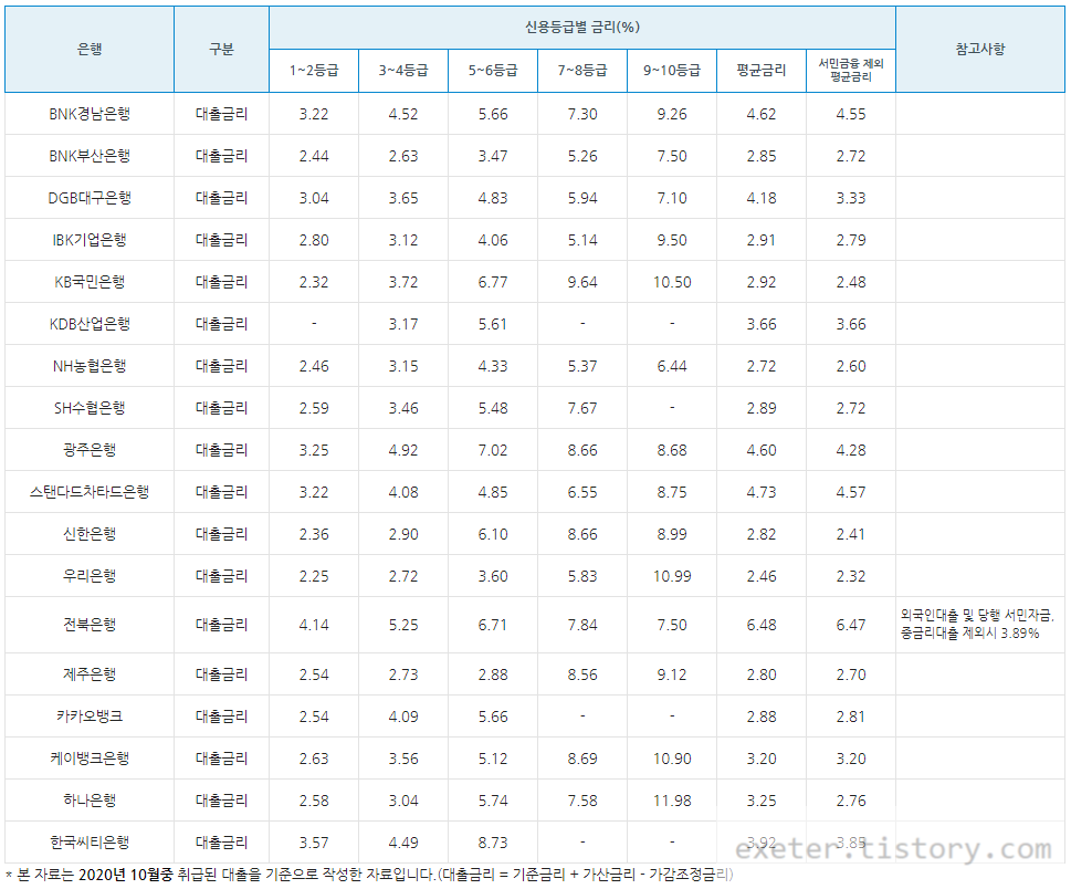 | [대출 금리] 2020년 10월 주택담보대출 금리 비교 (신용등급별) (0) | 2020.11.21 |