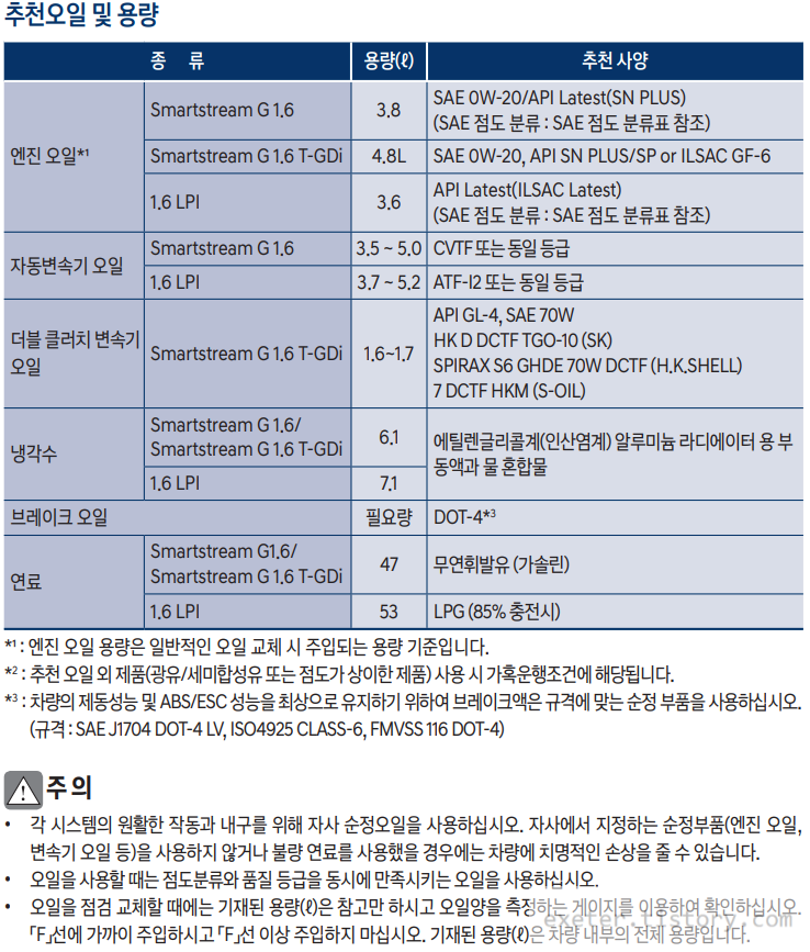 각 오일류 추천(순정)사양은 아래 표를 참조하세요.