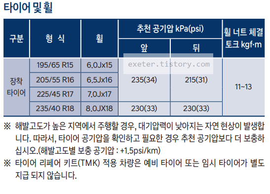 15~17인치 추천 공기압 (뒤): 215kpa (31psi)
