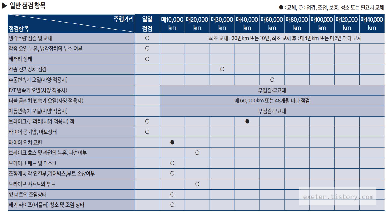 - 냉각수 점검 : 최초교환 200,000km 또는 10년, 최초 교환 후 매 40,000km 또는 매 2년마다 교환