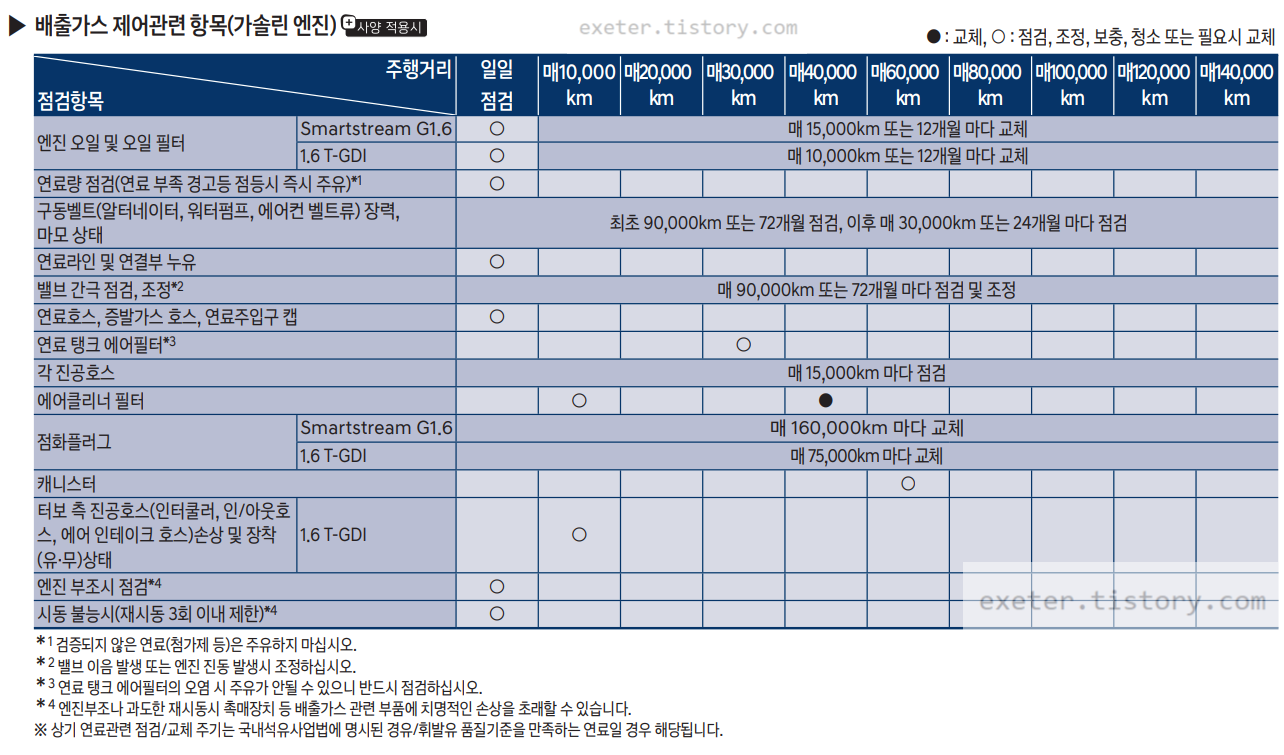 - 엔진오일(1.6 T-GDI): 매 10,000km 또는 12개월 마다 교체