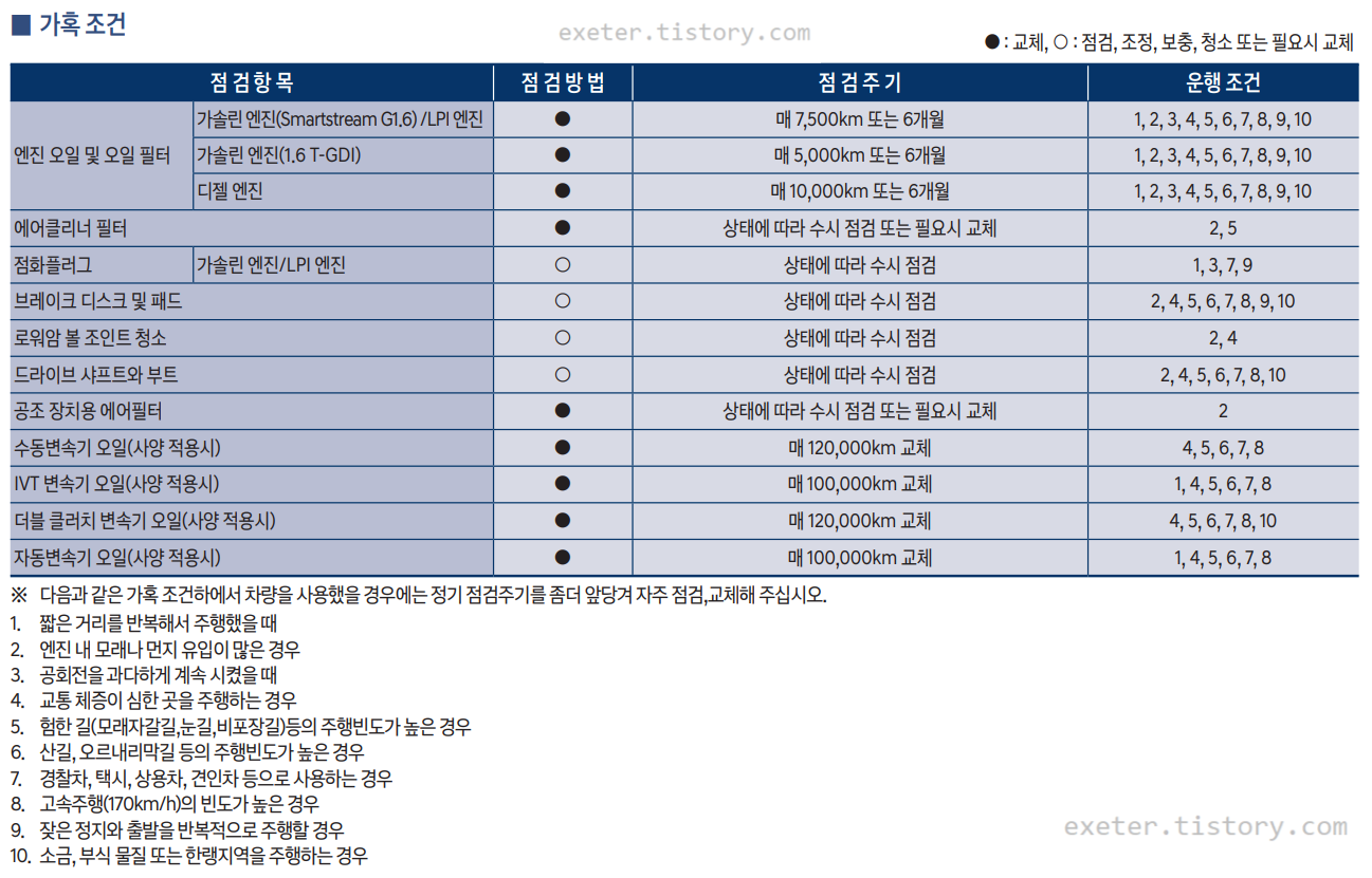 차량 설명서에서는 '가혹 조건'인 경우 교환/점검 주기를 빠르게 가져가도록 안내하고 있습니다.