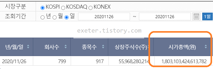 우선, 2020년 11월 26일 기준으로 KOSPI 시가총액은 약 1803조 원입니다.