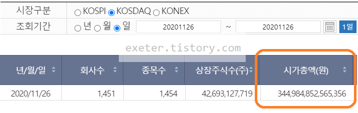 그리고 2020년 11월 26일 기준으로, KOSDAQ 시가총액은 약 345조 원입니다.
