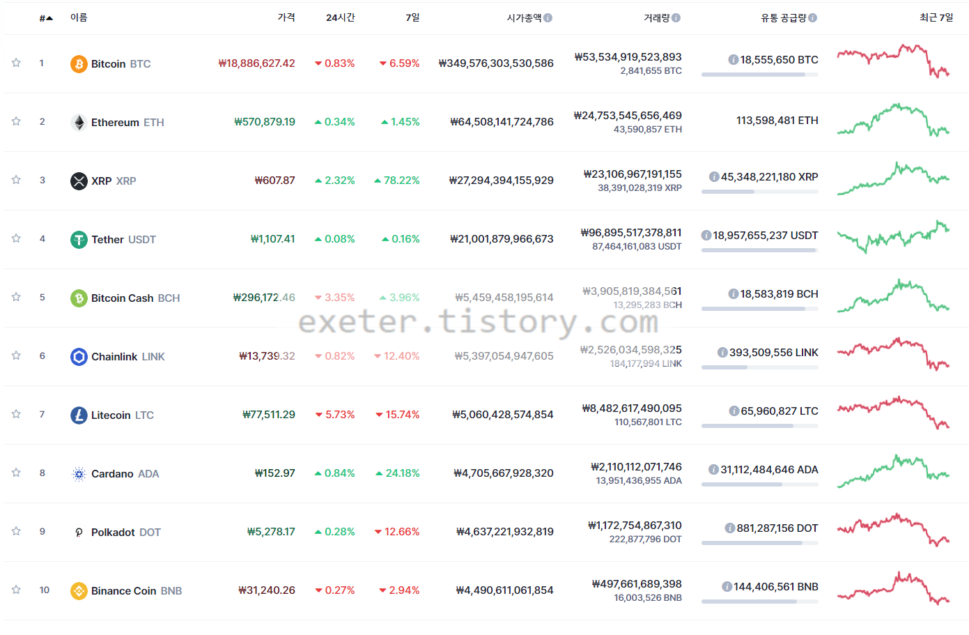 오늘 기준으로(글 작성 시작: 2020년 11월 27일 오후 10시 15분), 가상화폐 순위 (시가총액 기준) 상위 10개를 조회해봤습니다.