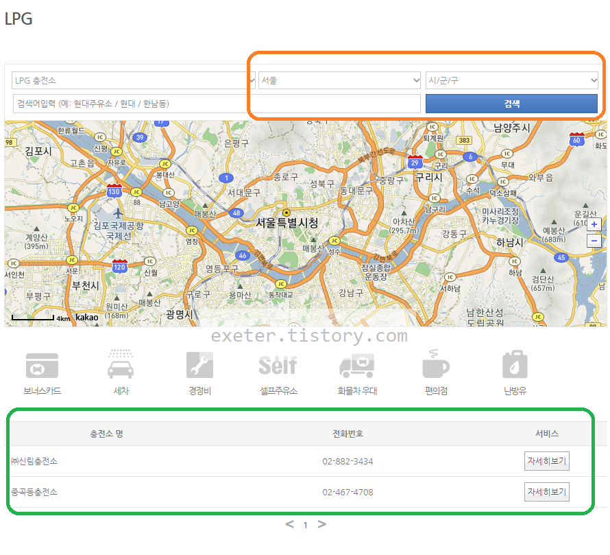 예를 들어, [서울] 지역 선택 후 [검색]을 선택하면 아래와 같이 'LPG' 충전소가 2개가 검색됩니다.