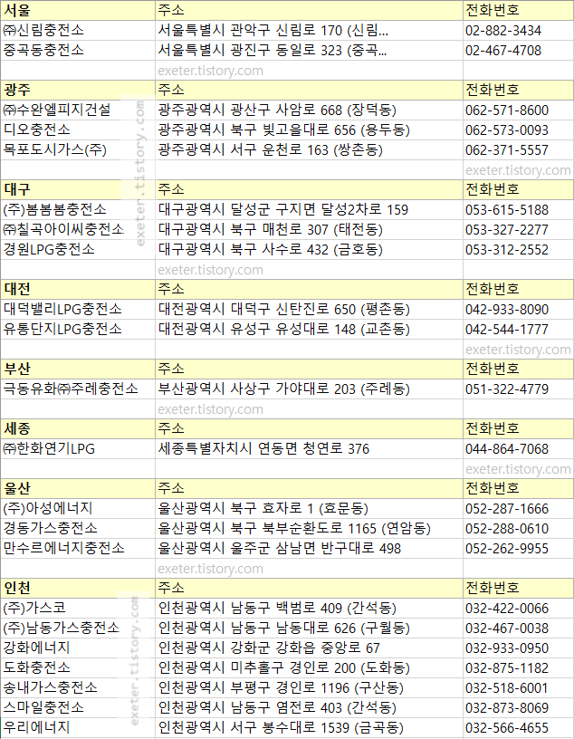 아래는 서울 및 광역시 등을(광주/대구/대전/부산/세종/울산/인천) 기준으로 현대오일뱅크 LPG 충전소 목록입니다.