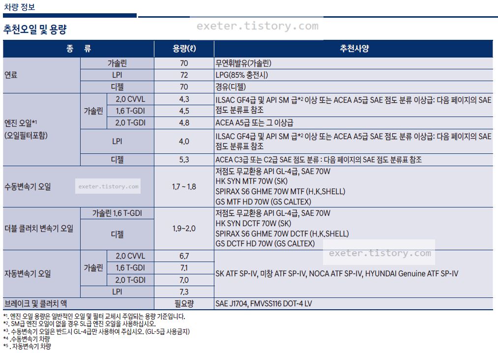 자동 변속기 오일 (2.0 T-GDI): 7.0 리터