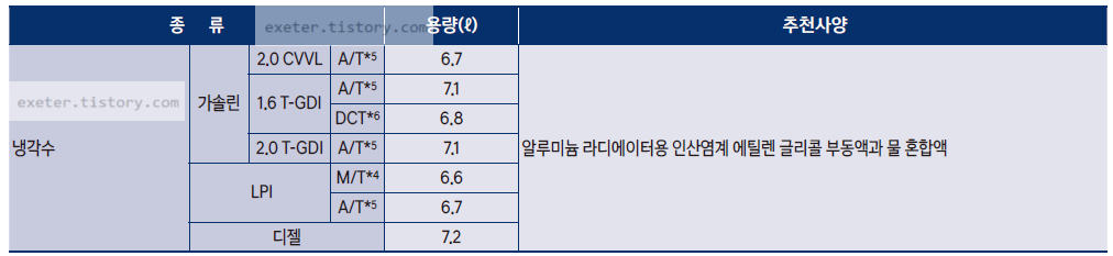 아래 냉각수 부분은 2020년식 매뉴얼에서 참고하였으나, 다른 년식에도 냉각수 용량은 동일합니다.