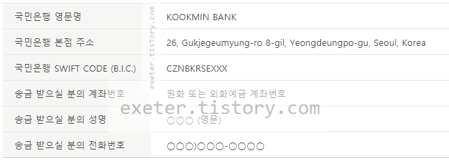 해외에서 국민은행으로 송금하는 경우 아래 정보를 참조하세요.