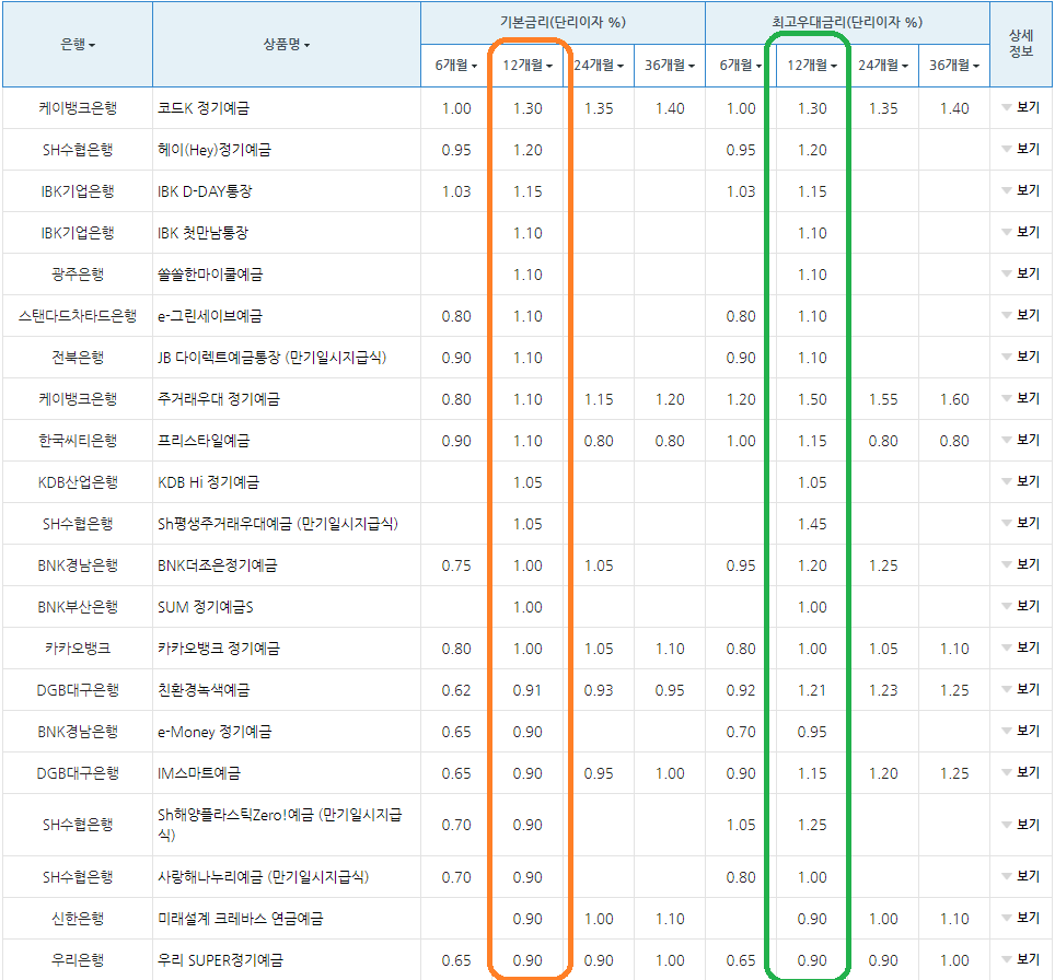은행 / 상품명 / 기본금리 (단리 이자(%), 12개월 기준)