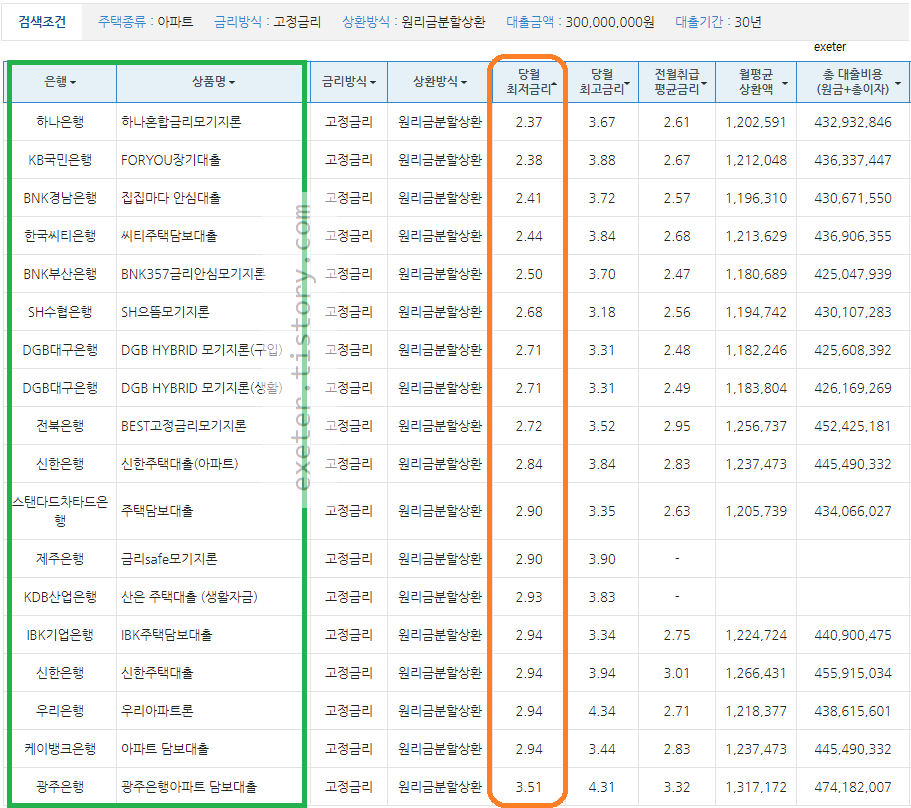 아래 표는 고정금리 기준이며, 보통 짧게는 3년~5년 정도 기간의 고정금리를 기준으로 합니다.