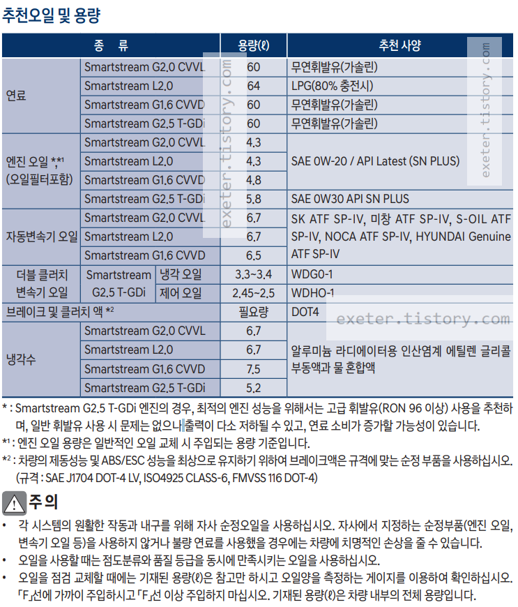 각 오일류 추천(순정) 사양은 아래 표를 참조하세요.