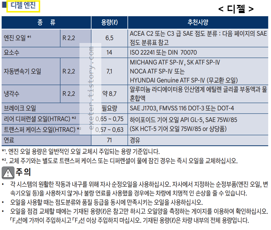 디젤 엔진 오일류 추천(순정) 사양은 아래 표를 참조하세요.