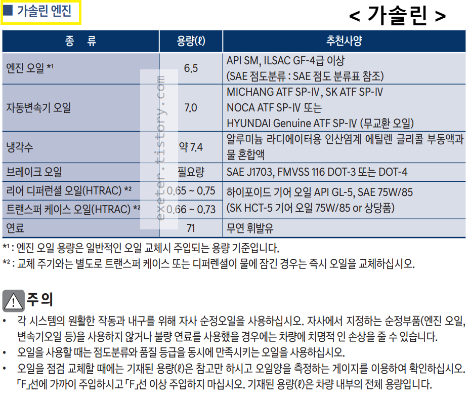 <가솔린 엔진; 추천오일 / 변속기 / 냉각수 등 용량 (단위: liter)>