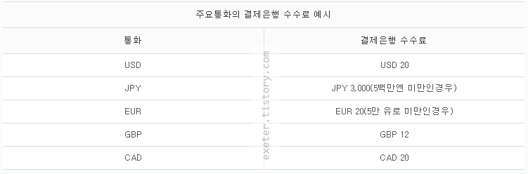 아래의 통화별 결제은행 수수료는 확정된 금액이 아니며, 결제은행별로 아래표의 금액보다 많은 금액을 청구하는 경우도 있습니다.