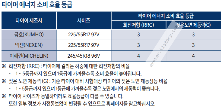 타이어 제조사: 금호/넥센/미쉐린 추천 '사이즈' 및 '에너지 소비 효율 등급'은 아래 그림 참고