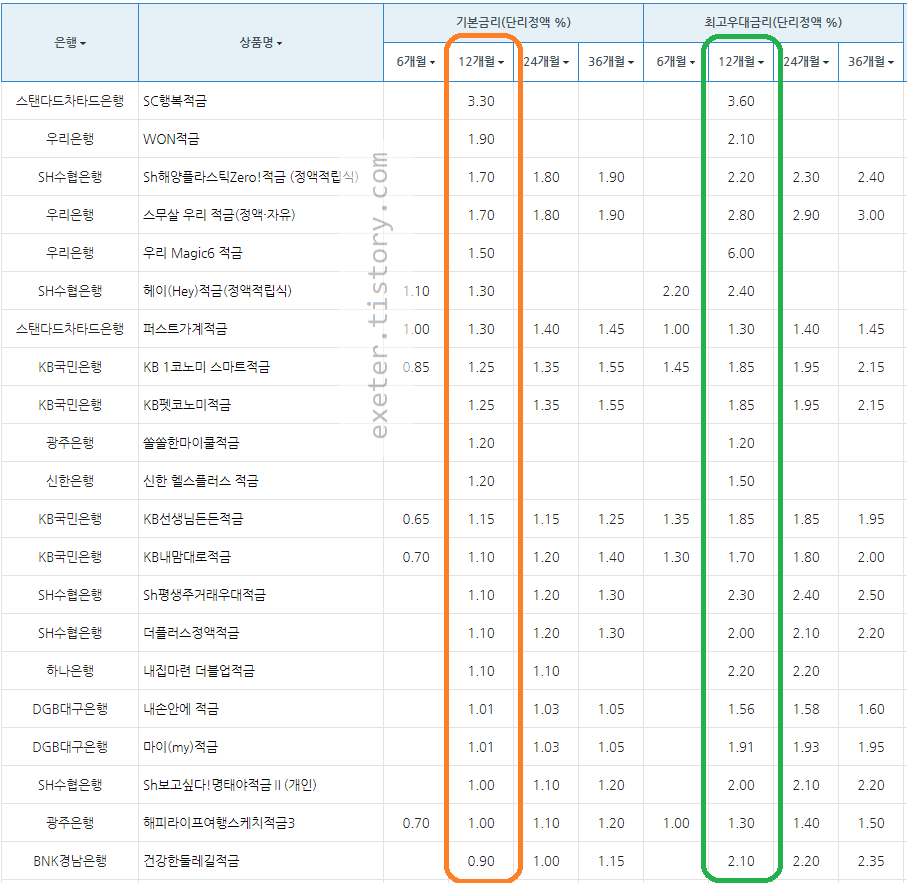 정기적금 금리의 경우 12월 27일 대비 상위 순위, 금리 변경 없이 동일합니다.