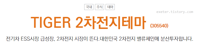 - [TIGER 2차전지테마]는 국내 시장에 상장된 2차전지 관련 기업에 투자하는 ETF 상품임