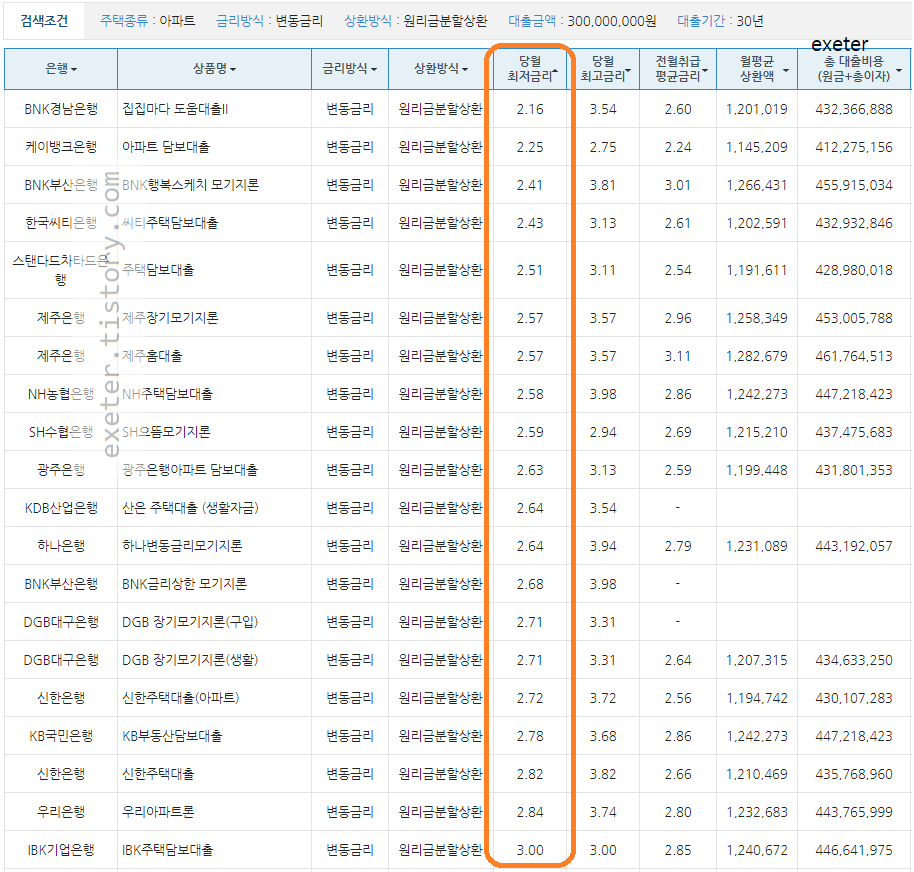 그 외에 케이뱅크은행/BNK부산은행/한국씨티은행/스탠다드차타드은행 순서로 금리가 낮았습니다. (2% 대 중반 수준)