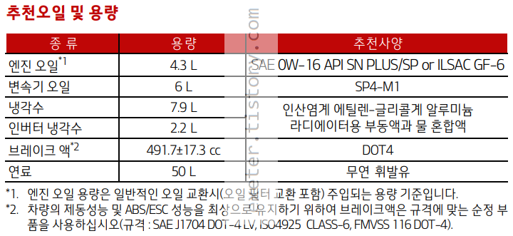 엔진오일: 4.3 리터 (SAE 0W-16 API SN PLUS/SP or ILSAC GF-6)