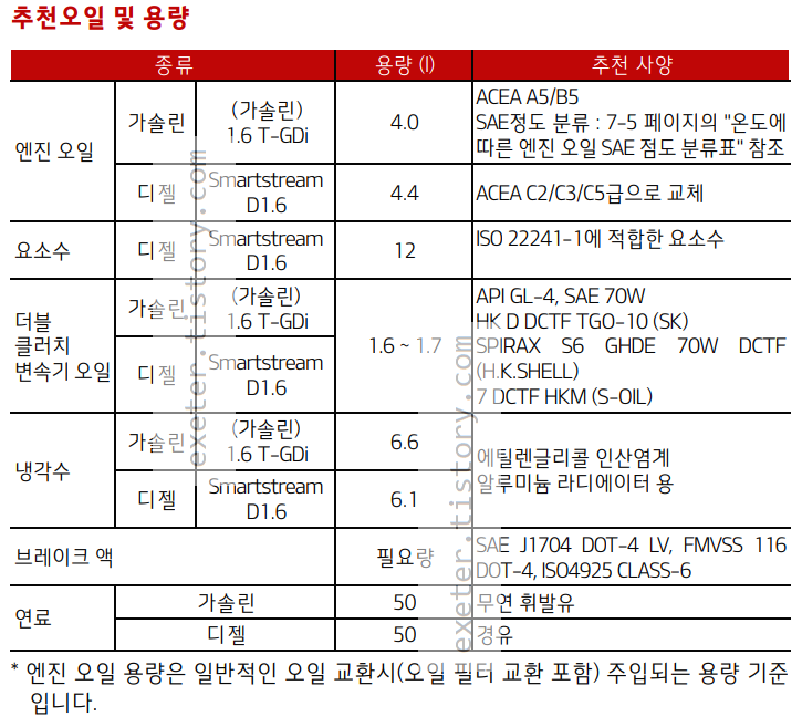 더블 클러치 변속기 오일(가솔린/디젤): 1.6 ~ 1.7 리터