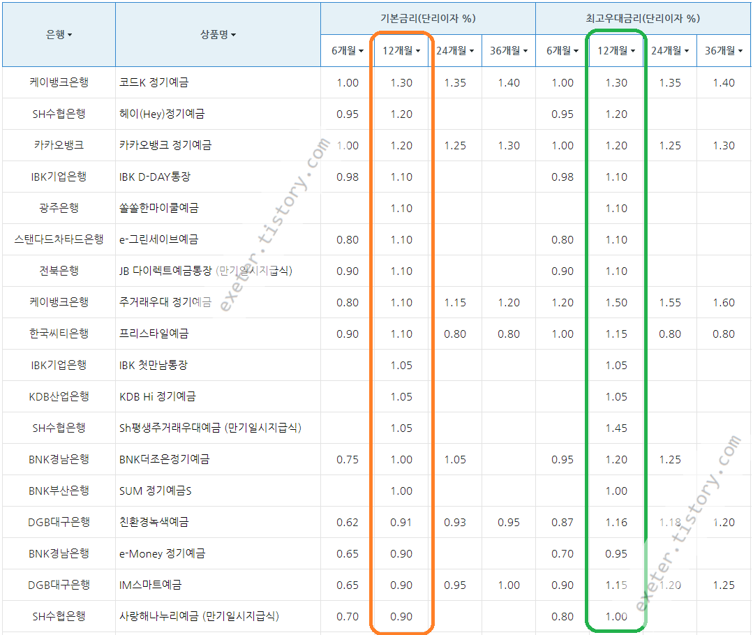 은행 / 상품명 / 기본금리 (단리 이자(%), 12개월 기준)