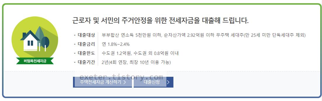 근로자 및 서민의 주거안정을 위한 전세자금 대출인 '버팀목 전세자금' 대출 안내 입니다.