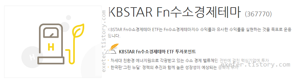 - [KBSTAR Fn수소경제테마]는 한국의 수소 경제 밸류체인 전반에 걸친 핵심기업에 투자 하는 ETF 상품임