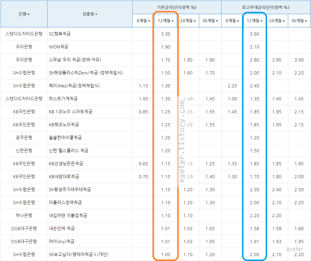 은행 / 상품명 / 정액 적립식 기본금리 (단리 이자(%), 12개월 기준)